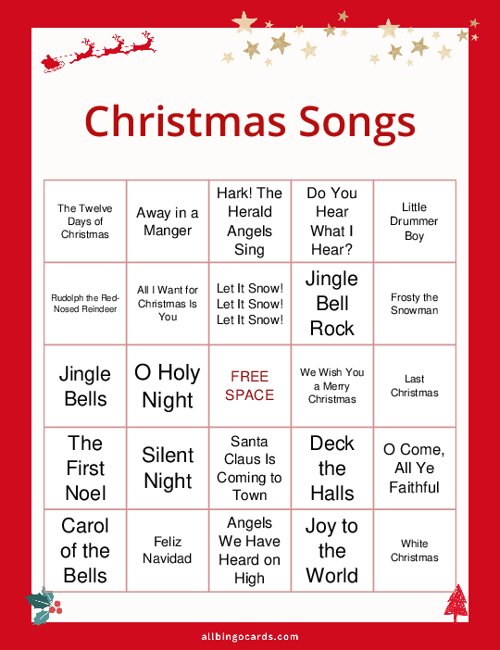 Download or make your own printable christmas songs bingo cards. The PDF file will include a calling sheet with all the words and random bingo cards. Press EDIT to customize the bingo cards.